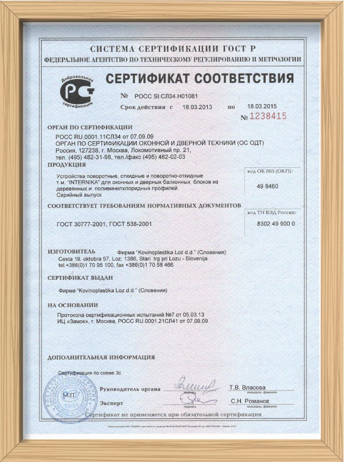 Фурнитура сертифицирована в России и немецком институте Rosenheim, отвечает всем европейским нормам.