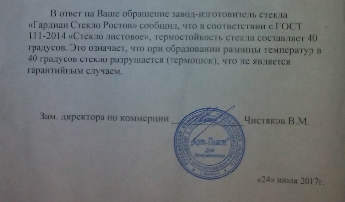 Как итог на судебном заседании АРТ-Пласт решил заменить стеклопакет за свой счет.